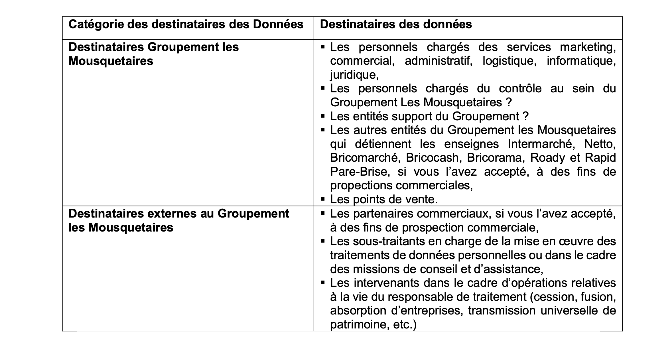 Nous transmettons vos Données aux points de vente à l’enseigne Bricorama, aux prestataires intervenants dans le cadre des finalités mentionnées ci-dessus, ainsi qu’aux transporteurs afin qu’ils puissent assurer l’exécution de vos commandes. Si vous l’avez accepté au préalable, nous pourrons aussi transférer vos Données à d’autres sociétés du Groupement des Mousquetaires ainsi qu’à nos partenaires commerciaux, selon leurs attributions et en fonction des finalités poursuivies :